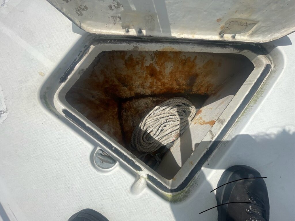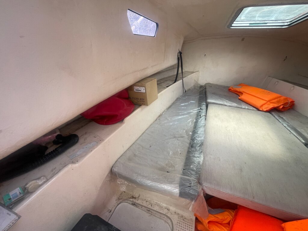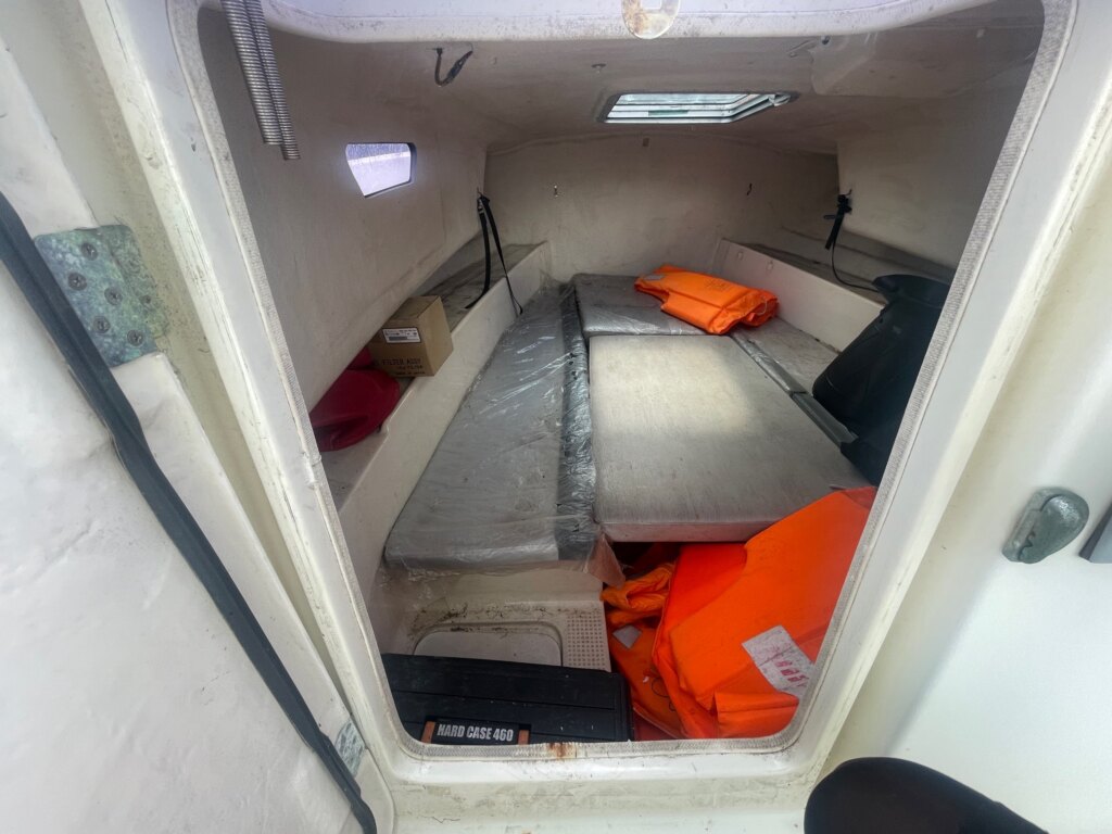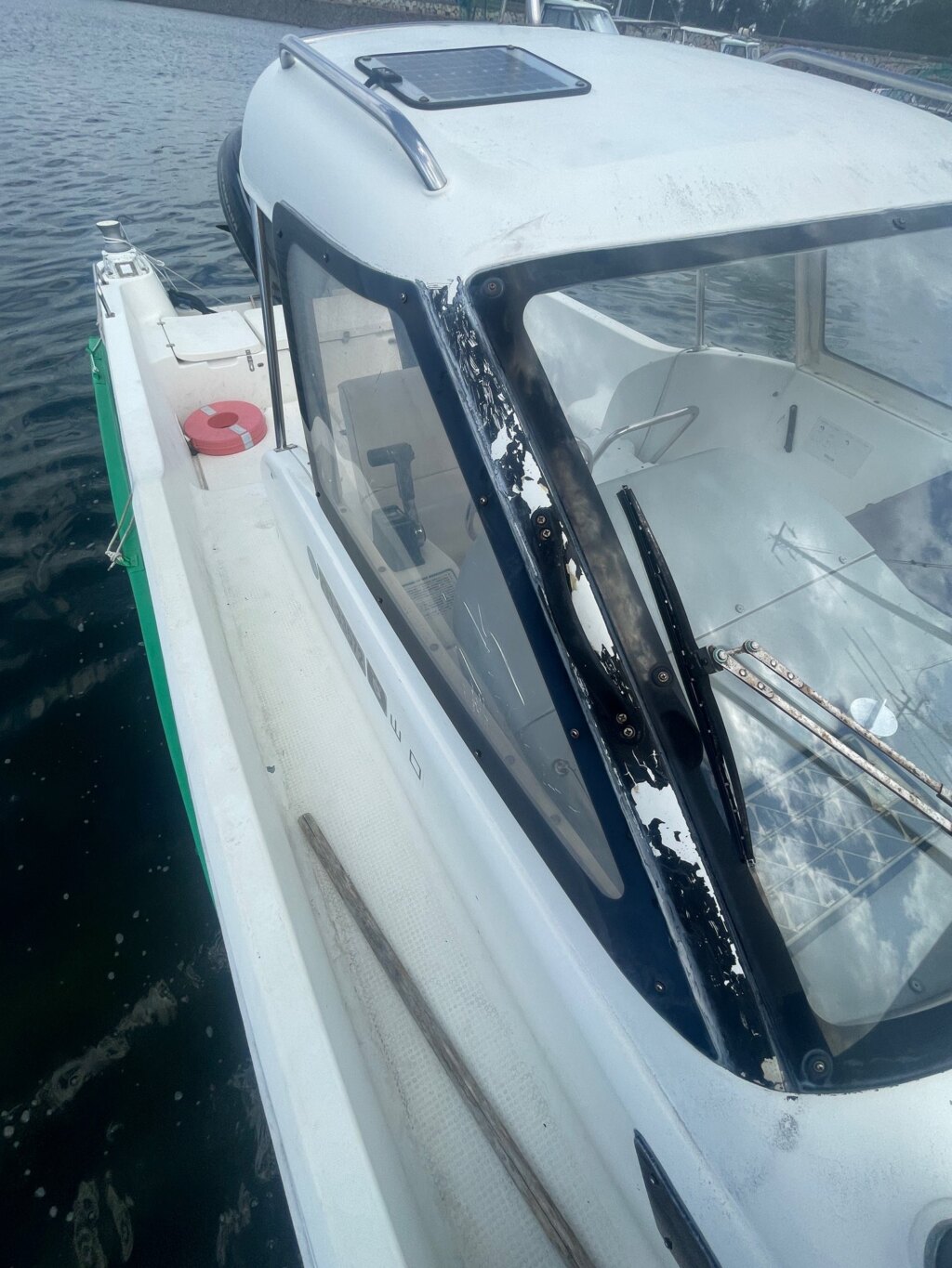 船首部分のガンネルに割れ、補修があります。キャビン入口の扉のヒンジが外れてます。