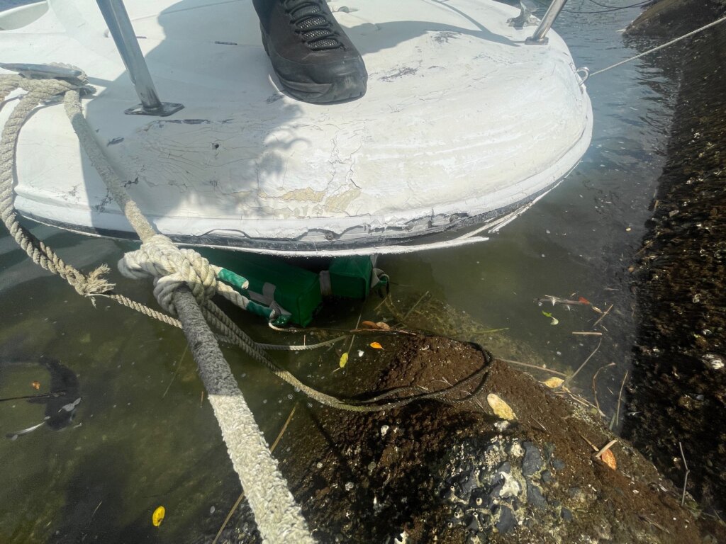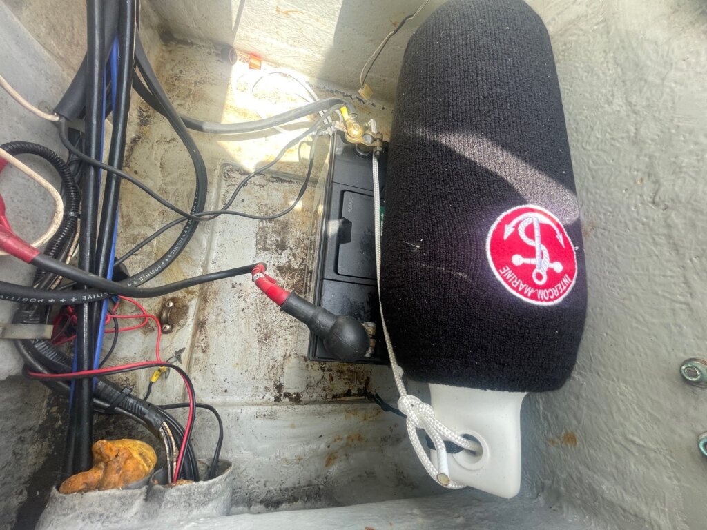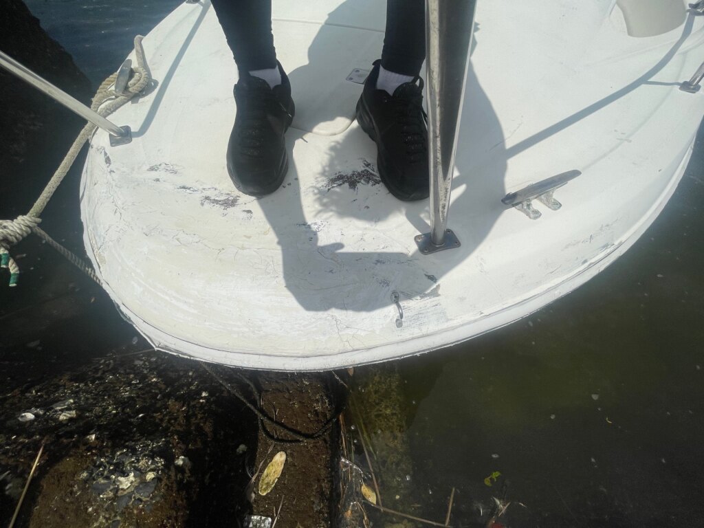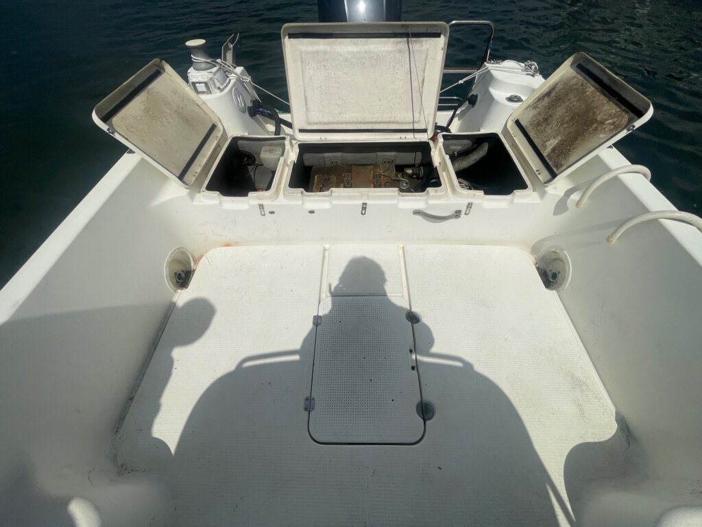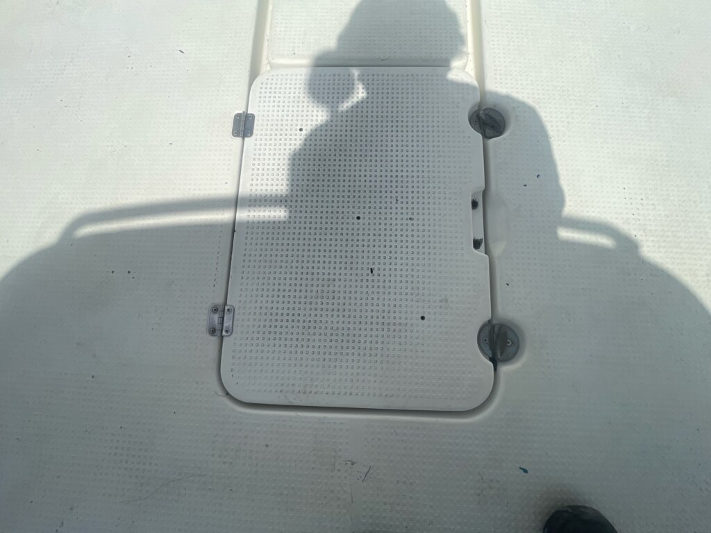 船首部分のガンネルに割れ、補修があります。キャビン入口の扉のヒンジが外れてます。